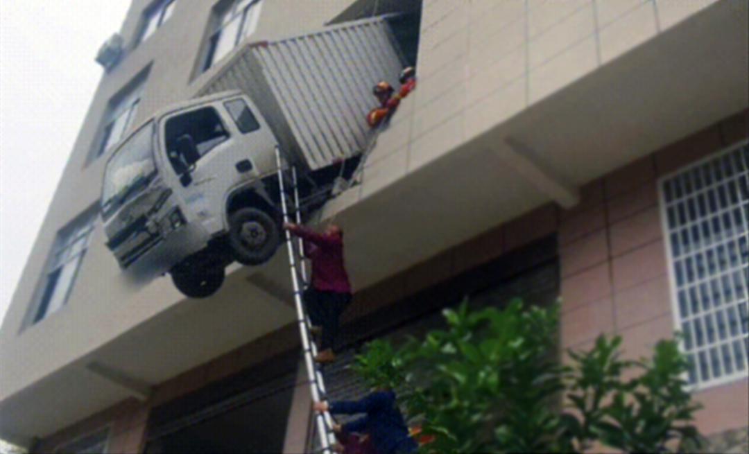 حادثة غريبة.. شاحنة تتدلى من مبنى